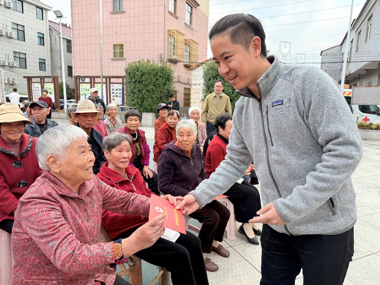 村里的文化舞臺(tái)下,紅底黃字的“重陽(yáng)慰問”橫幅早早就掛了起來;辦公樓前,一袋袋米油面碼得整整齊齊;志愿者們忙忙碌碌穿梭其間,熟絡(luò)地給老人們剪指甲、梳頭發(fā)、嘮家常——10月27日上午,金東區(qū)嶺下鎮(zhèn)摩訶村文化廣場(chǎng)上,洋溢著濃濃的節(jié)日氛圍。在2025年重陽(yáng)節(jié)來臨之際,金廈集團(tuán)總裁傅融率集團(tuán)高層再次走進(jìn)摩訶村,帶著心意,赴這場(chǎng)持續(xù)了14年的“敬老之約”。